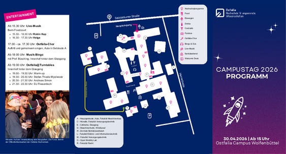 On 30 April 2026, the Ostfalia Campus Wolfenbüttel will be transformed into a lively festival site: at Campus Day 2026, the doors will open from 3 p.m. for everyone who is interested in science, music and community.